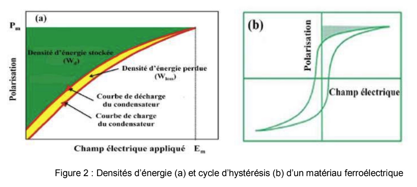 L’objectif de ce travail est de développer des matériaux ferroélectriques sans plomb, pour se conformer à la directive européenne RoHS, sous forme de céramiques et films minces, pour le développement de condensateurs à haute capacité de stockage d’énergie. Ces matériaux devront avoir une permittivité diélectrique élevée, une bonne stabilité en fréquence et en température, de faibles pertes diélectriques, une polarisation maximale élevée, et une faible polarisation rémanente pour optimiser l’efficacité de stockage énergétique (figure 2).